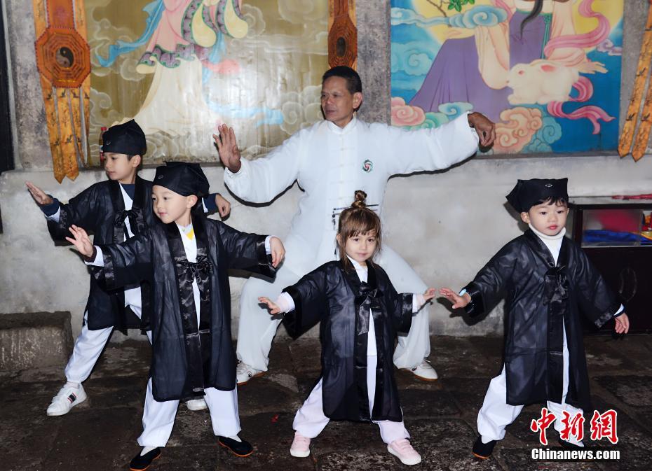 10月16日,在“道教名山”、世界自然遺產(chǎn)地江西上饒三清山,5名來自中外的萌娃身穿統(tǒng)一道服,手持竹簡,在三清宮跟著道教師傅朗讀《道德經(jīng)》、《弟子規(guī)》,學習太極拳、書法、古箏等中國傳統(tǒng)文化。這群萌娃中年齡最小的僅11個月,年齡最大也只有6歲。程希雪攝