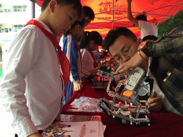 同期,愛匯百變教育科技有限公司也給同學(xué)帶來了炫酷多彩的編程大餐。通過對EV3編程機器人項目LEGO方針機械機構(gòu)以及LEGO圖形化編程展示,邀請現(xiàn)場同學(xué)進(jìn)行對套件進(jìn)行組裝、編程控制,普及編程和電磁感應(yīng)現(xiàn)象、電動基本原理、電路等物理知識,鍛煉學(xué)生科學(xué)創(chuàng)造思維,培養(yǎng)學(xué)科興趣。