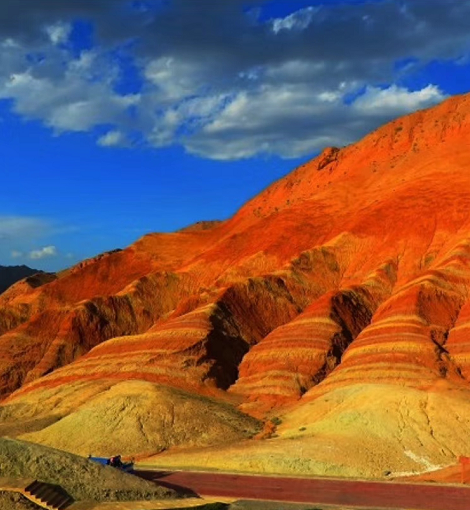 夜宿張掖丹霞公園,早晚之景,分外別致,既有朝陽晚霞的映襯,也有山貌土質的特性,構筑成一幅幅天地合一的壯麗畫面,于是,我又寫下來“猜2”——-丹陽裸照山土紅,晚霞斜映溝丘重,七色帶環(huán)競爭艷,彩云作被情更濃!此又何處?
