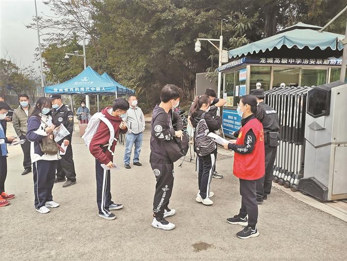 龍高黨員志愿者考前在校門口檢測學生體溫。
