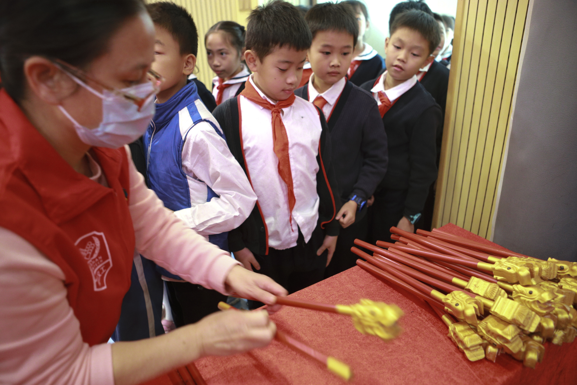 參加本次活動的學(xué)生們大感驚喜和意外,他們在入場的時候都從工作人員的手上領(lǐng)到一份特別可愛的佾舞“龠翟”的小道具。
