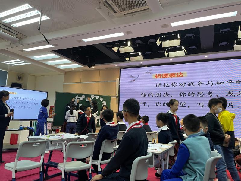 上午8:30分,益田小學(xué)一樓禮堂內(nèi)首先進(jìn)行室內(nèi)升旗儀式,在場(chǎng)師生滿懷祭奠之情,為受難者默哀一分鐘,致敬逝者,寄托民族哀思。接著,四(3)班中隊(duì)表演了相關(guān)詩(shī)朗誦以及“銘記歷史,努力學(xué)習(xí)宣誓“活動(dòng),最后,益田小學(xué)名師、福田區(qū)品牌課程主持人嚴(yán)霞老師帶領(lǐng)學(xué)生上了一節(jié)別開生面的思政課 《和平是什么》,嚴(yán)老師通過閱讀相關(guān)繪本和文字,以及學(xué)生喜聞樂見的講故事、繪本閱讀、觀看視頻等多樣的教學(xué)方式,引導(dǎo)學(xué)生了解公祭日的由來,思考、感知戰(zhàn)爭(zhēng)的慘痛與和平的可貴,時(shí)刻謹(jǐn)記中國(guó)遭受過的屈辱歷史決不能重演!