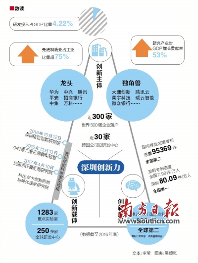 其一,企業(yè)主導,政府給力。在整個創(chuàng)新體系中,企業(yè)是技術(shù)創(chuàng)新主體,代表著市場取向;政府是制度創(chuàng)新的主體,主要任務(wù)是營造良好的創(chuàng)新環(huán)境,彌補市場失靈的不足。只有處理好政府和市場的關(guān)系,才能推動整個創(chuàng)新體系不斷完善。因此,深圳一方面讓企業(yè)唱主角,支持企業(yè)創(chuàng)新創(chuàng)業(yè),華為、中興、騰訊、比亞迪等“龍頭”企業(yè)持續(xù)做大做強,大疆創(chuàng)新、光啟、柔宇科技等“獨角獸”企業(yè)迅速發(fā)展;另一方面,政府從政策和規(guī)劃層面加強創(chuàng)新體系頂層設(shè)計,圍繞科技管理機制創(chuàng)新、創(chuàng)業(yè)創(chuàng)新能力提升、強化對外合作等方面構(gòu)建政策支持體系,以企業(yè)為創(chuàng)新驅(qū)動核心、以企業(yè)家群體為創(chuàng)新精神內(nèi)核、政策金融人才協(xié)同共生的創(chuàng)新生態(tài)系統(tǒng)加速形成。