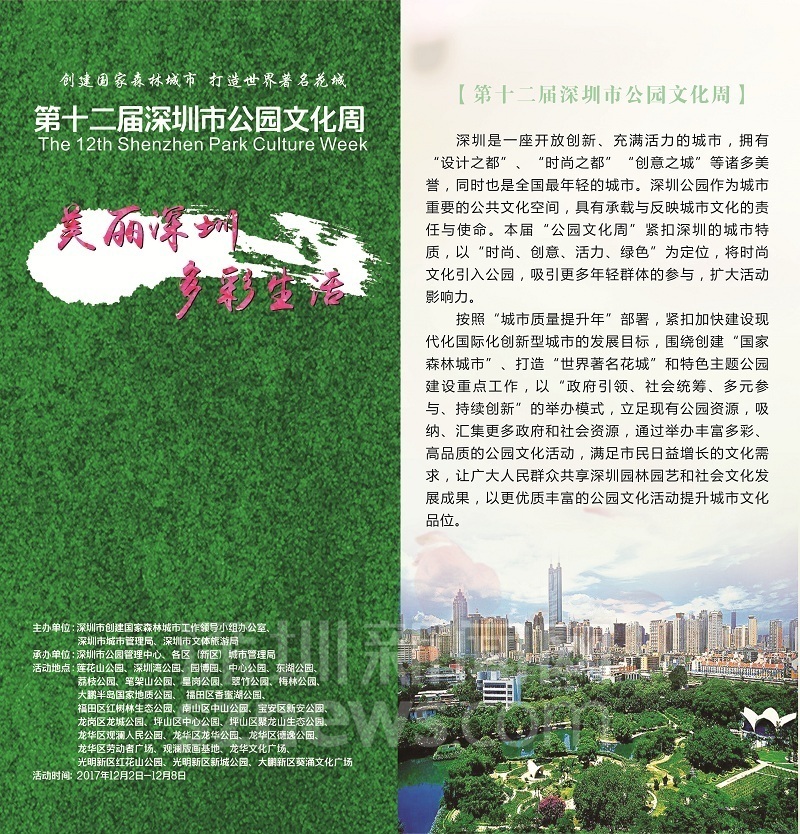 深圳新聞網12月1日訊(記者 鐘鴻冰 通訊員 崔嵩)一年一度的公園文化節(jié)即將到來,12月2日-12月8日,2017年第十二屆公園文化周將在全市27家公園舉行。本屆公園文化周緊密結合創(chuàng)建“國家森林城市”和打造“世界著名花城”重點工作,以“美麗深圳 多彩生活”為主題,充分展現(xiàn)美麗宜居的城市環(huán)境及豐富多彩的城市文化生活。