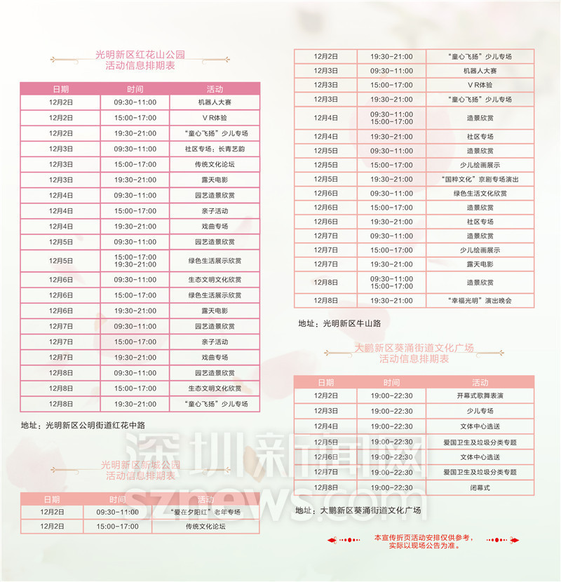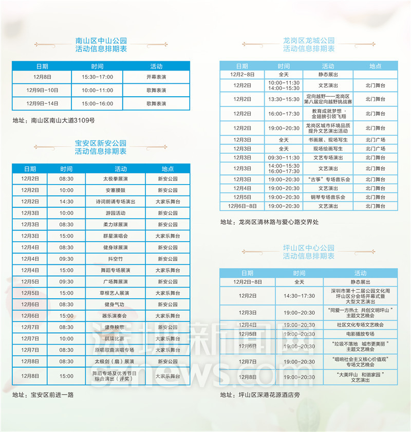 本屆公園文化周共設27個會場,其中市屬公園設11個會場,區(qū)屬公園設16個會場,這也是公園文化周自舉辦以來承辦會場最多的一屆。其中,福田區(qū)首次參與公園文化周,該區(qū)紅樹林生態(tài)公園以及今年新開放的香蜜公園均參與了本次活動。此外,坪山區(qū)的聚龍山生態(tài)公園,龍華區(qū)的龍華人民廣場、觀瀾人民公園、龍華公園、德逸公園、勞動者廣場均是首次參與“公園文化周”的承辦,讓更多市民在家旁邊就感受到公園文化和公園的建設成果。