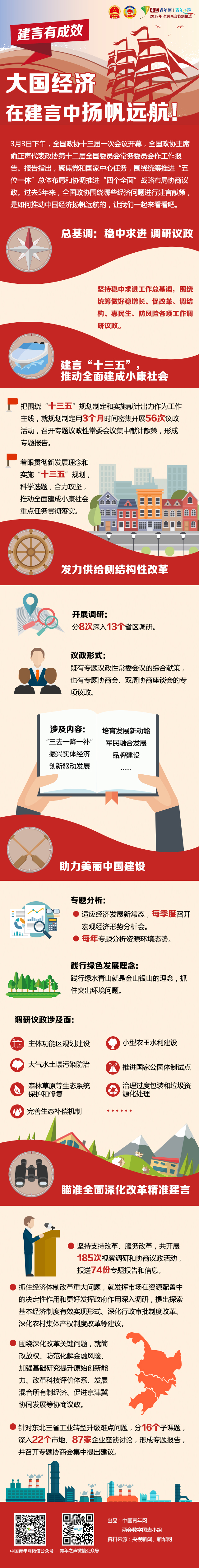 中國青年網(wǎng)北京3月4日電 3月3日下午,全國政協(xié)十三屆一次會議開幕,全國政協(xié)主席俞正聲代表政協(xié)第十二屆全國委員會常務(wù)委員會作工作報告。報告指出,聚焦黨和國家中心任務(wù),圍繞統(tǒng)籌推進“五位一體”總體布局和協(xié)調(diào)推進“四個全面”戰(zhàn)略布局協(xié)商議政。過去5年來,全國政協(xié)圍繞哪些經(jīng)濟問題進行建言獻(xiàn)策,是如何推動中國經(jīng)濟揚帆遠(yuǎn)航的,讓我們一起來看看吧。