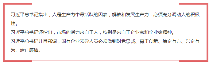 中國特色社會(huì)主義進(jìn)入新時(shí)代,建設(shè)現(xiàn)代化經(jīng)濟(jì)體系,推動(dòng)經(jīng)濟(jì)發(fā)展質(zhì)量變革、效率變革、動(dòng)力變革,需要更好發(fā)揮包括國有企業(yè)家在內(nèi)的廣大企業(yè)家的作用。去年黨中央專門印發(fā)了《關(guān)于營造企業(yè)家健康成長環(huán)境,弘揚(yáng)企業(yè)家精神、更好發(fā)揮企業(yè)家作用的意見》,極大地調(diào)動(dòng)了企業(yè)家干事創(chuàng)業(yè)的積極性。落實(shí)好中央精神,關(guān)心愛護(hù)企業(yè)家,需要各方面共同努力。
