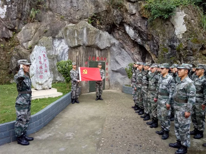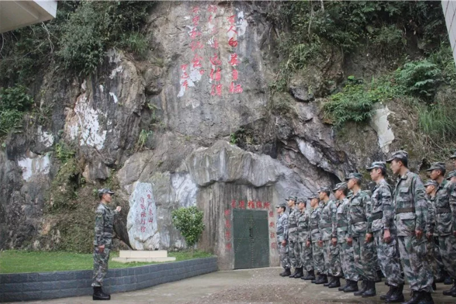 巖石旁,南部戰(zhàn)區(qū)陸軍某邊防旅“鋼七連”升起的國(guó)旗迎風(fēng)招展,與鮮紅的大字交相輝映。戰(zhàn)壕軍史館就坐落于此處。