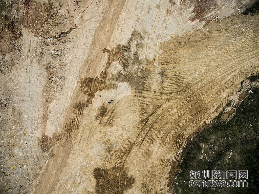 ?記者站在渣土場的坡頂看到,數(shù)十層樓高的渣土堆很是壯觀,一眼望不到邊。而地面行車的痕跡清晰可見,不經(jīng)意間還可以看到一些土坡上的裂紋。據(jù)保安介紹,裂紋是因下雨所致。