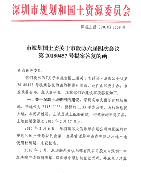 2018年2月,經(jīng)深圳市人民政府批準(zhǔn),深圳市規(guī)土委依法向深圳高爾夫俱樂部有限公司發(fā)出了《關(guān)于B0015-0038宗地建設(shè)用地使用權(quán)到期交回通知書》,由深圳高爾夫俱樂部有限公司清算組正式簽收。