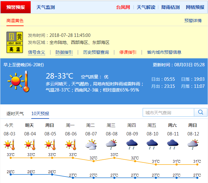 近期天氣方面,預(yù)計(jì)3日多云間晴天,天氣酷熱,局地有短時(shí)陣雨或雷陣雨,氣溫27-33℃,北部和人口密集區(qū)局地最高氣溫可達(dá)35℃;4-7日多云,局部有短時(shí)(雷)陣雨。請(qǐng)注意持續(xù)高溫下的防暑降溫和戶外活動(dòng)、戶外作業(yè)的安全;關(guān)注局地雷雨的影響,發(fā)布雷電預(yù)警時(shí),需遠(yuǎn)離高山、開闊的地方以及樹下、較淺的山溝或者山洞、水面等地區(qū)。