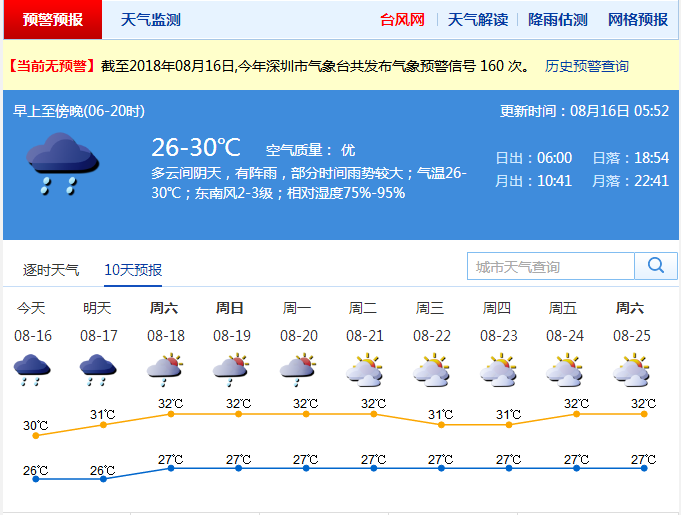 市氣象臺預(yù)計,8月16日受臺風(fēng)"貝碧嘉"外圍環(huán)流影響,深圳多間歇性的降雨,局部暴雨;沿海和高地最大陣風(fēng)可達(dá)6至7級。預(yù)計8月17日有陣雨;8月18日至20日多云有短時陣雨,天氣趨于炎熱。