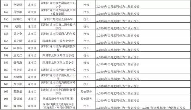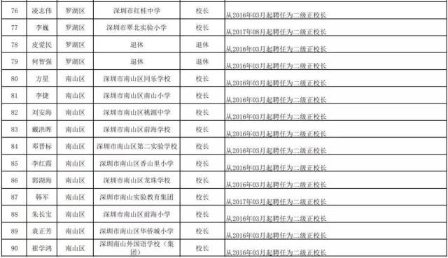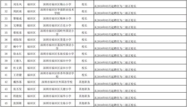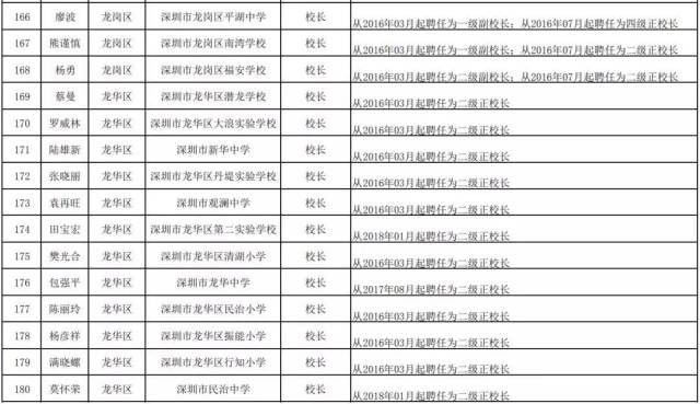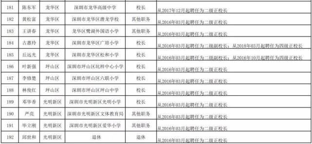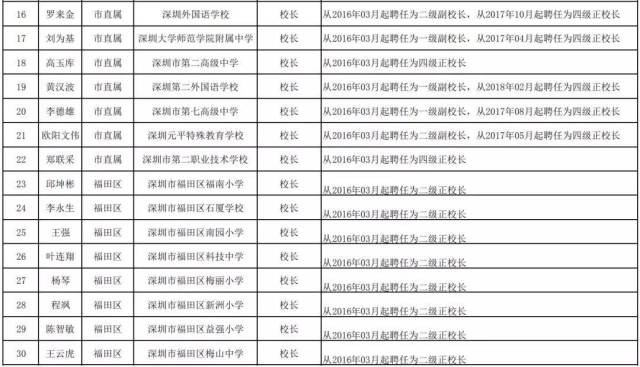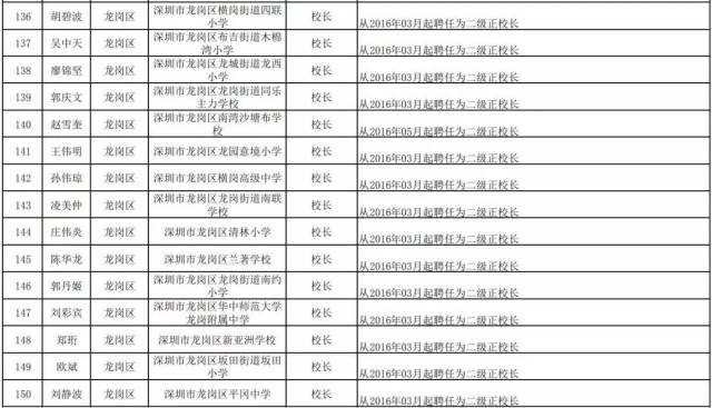 此次公示名單中,職級最高的是二級正校長,特級和一級正校長空缺。此次公示的二級正校長共157人,其中市直屬10人。各區(qū)中,二級正校長最多的是福田區(qū),共有32人,龍崗和寶安緊隨其后,分別有29、27人。羅湖、南山、龍華三區(qū),則分別有19、16和13人。其他各區(qū)的二級正校長均在10人以內(nèi)(大鵬新區(qū)暫無)。