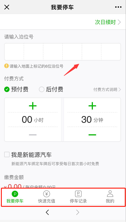 按箭頭填上泊位號,填好預(yù)付費或后付費,選擇預(yù)停時間,點擊確定即可。