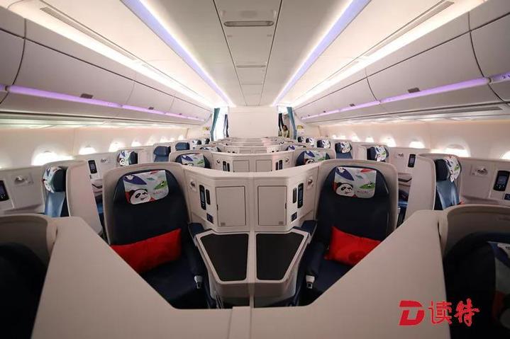 除了色彩繽紛的熊貓彩繪之外,機(jī)艙內(nèi)的熊貓?jiān)仉S處可見,仿佛把大熊貓基地搬上了天。