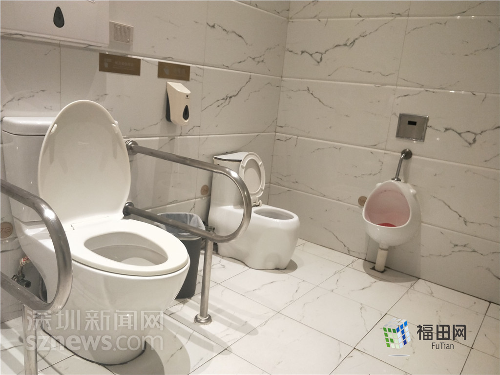 直播的第三站來(lái)到福田街道的君尚百貨,突擊檢查商場(chǎng)一樓的廁所。記者看到,君尚百貨的衛(wèi)生間十分明亮寬敞,并且配備了無(wú)障礙洗手間和嬰幼兒盥洗室。嬰幼兒盥洗室內(nèi),可以看見(jiàn)小一號(hào)的馬桶和小便池,洗手液也安裝在墻面較矮的地方。除此之外,男廁女廁內(nèi)都比較干凈,紙巾、洗手液、烘干機(jī)等設(shè)備齊全,隔間地面干凈,沒(méi)有發(fā)現(xiàn)臟污的地方。