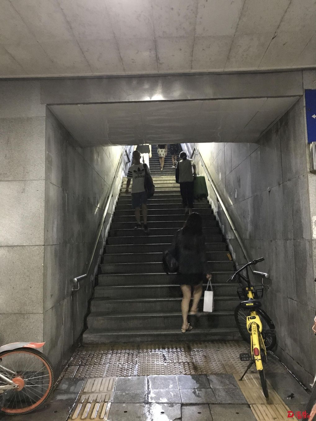 深南大道東門過街通道,雨天漏水,地板破損,臺(tái)階沒有坡道,行李箱與自行車得靠人扛