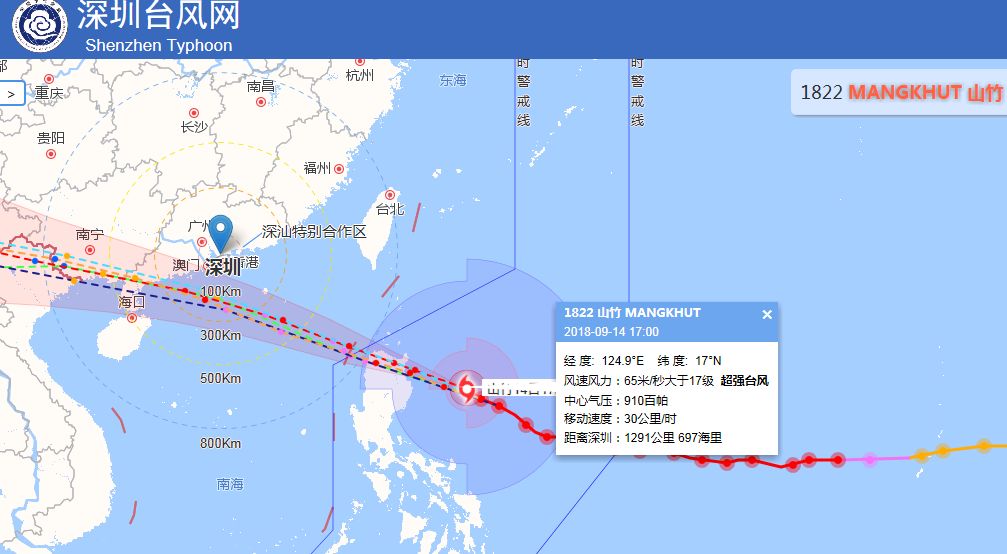 預(yù)計“山竹”將于14日夜間橫穿菲律賓呂宋島北部山地,15日上午進入南海東北部海面,強度減弱,趨向粵西和海南東部沿海,16日夜間在上述地區(qū)以強臺風(fēng)或超強臺風(fēng)登陸,16日中午前后距我市最近200-300公里。不排除在陽江至茂名之間登陸、對深圳造成更大風(fēng)雨影響的可能。