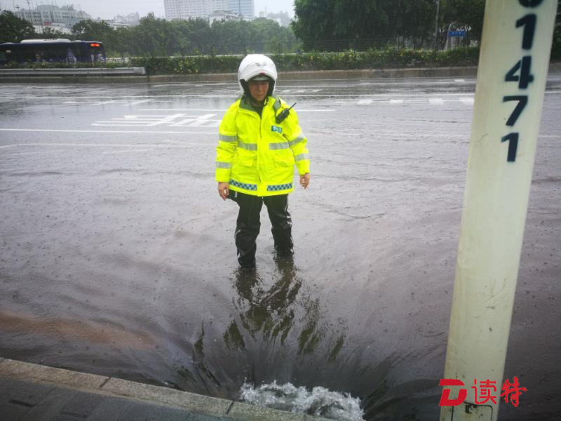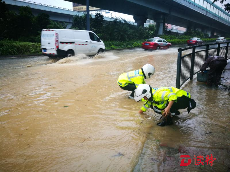 但是,眼前的情況,他們無(wú)法視而不見(jiàn)。深鹽二通道下方,羅沙路羅湖公安分局調(diào)頭口處,當(dāng)艾力軍經(jīng)過(guò)這里時(shí)發(fā)現(xiàn)由于地勢(shì)低洼路面已經(jīng)嚴(yán)重積水,他們馬上停下車,疏通下水道。一行人在風(fēng)雨中走進(jìn)機(jī)動(dòng)車道,沿著路邊只能用手在積水中摸索排水口的位置,將阻塞入水口的樹(shù)枝樹(shù)葉掏出來(lái)。但風(fēng)急雨驟,道路積水水位剛下降一點(diǎn),剛被清理的下水道又堵樹(shù)葉、樹(shù)枝等雜物堵上,他們只好不斷地進(jìn)行著重復(fù)的動(dòng)作。而此時(shí),臺(tái)風(fēng)“山竹”距離深圳接近130公里,羅湖片區(qū)測(cè)得最大陣風(fēng)達(dá)16級(jí)。
