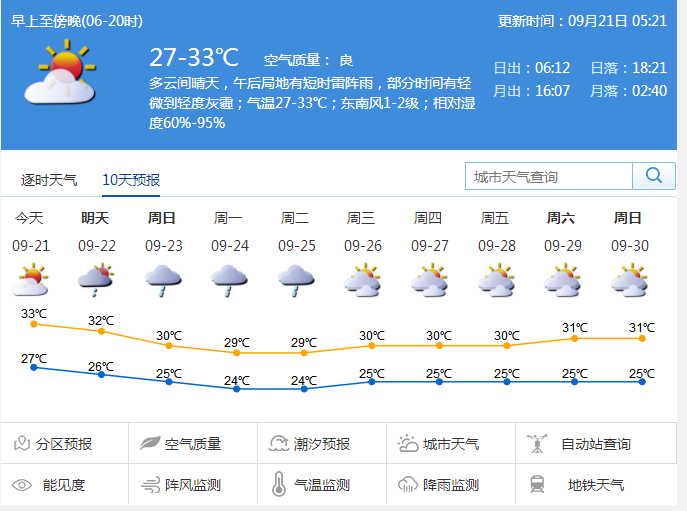 深圳市氣象臺(tái)提醒,21日深圳天氣炎熱,請(qǐng)注意做好防暑降溫;部分時(shí)間有輕微灰霾,建議根據(jù)灰霾條件合理安排戶(hù)外活動(dòng)。此外,中秋假期出行或有陣雨,注意攜帶雨具。