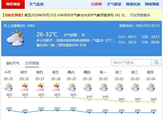市氣象臺預測,26日,受偏東氣流影響,多云間陰天,有短時雷陣雨,氣溫為25-32℃。27日起,轉東北風影響,天氣晴朗,最高氣溫32-33℃。預計超強臺風“潭美”將趨向呂宋島以東洋面,未來幾天對深圳無風雨影響。(記者李秀瑜)