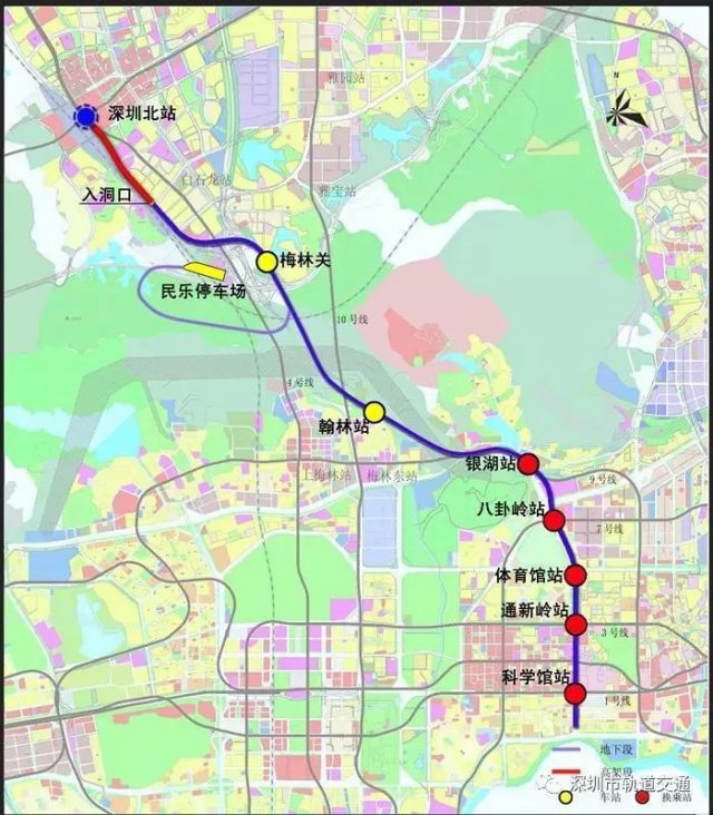 6號線二期工程線路全長約11.8Km,包括7站7區(qū)間、其中換乘車站4座,從深圳北站預(yù)留高架橋工程引出,途徑龍華、福田、羅湖三區(qū)。