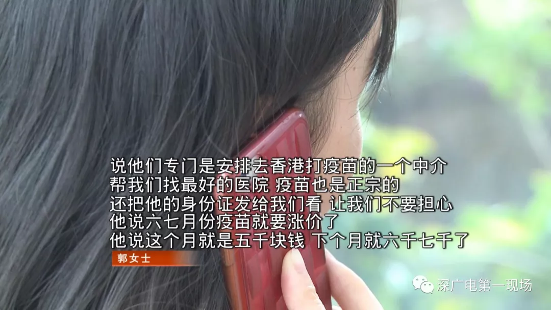 郭小姐說她的同事3、4月份交的錢,都要排到10、11月才能打上針。按中介的說法,因為前面有比早交錢的人都在排號,這個疫苗幾個月才打一次,第一針承諾郭小姐是8月份打,第二針要12月份打,第三針到明年3月份打。