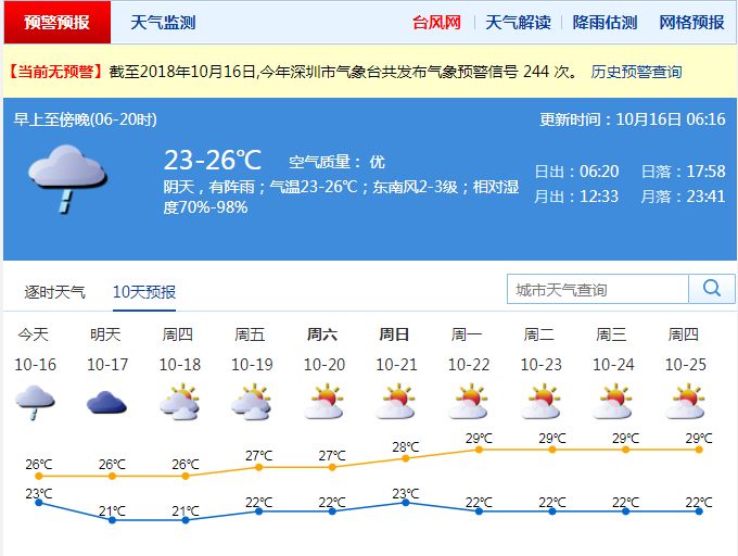 深圳市氣象局提醒,16日 ~17日陰天有雨,雨天路面濕滑能見度差,對(duì)交通影響較大,需注意防范降雨對(duì)上班高峰期帶來的不利影響。預(yù)計(jì)17日重陽節(jié)早晨仍有分散小雨,路面濕滑,戶外登高要注意防滑保暖。