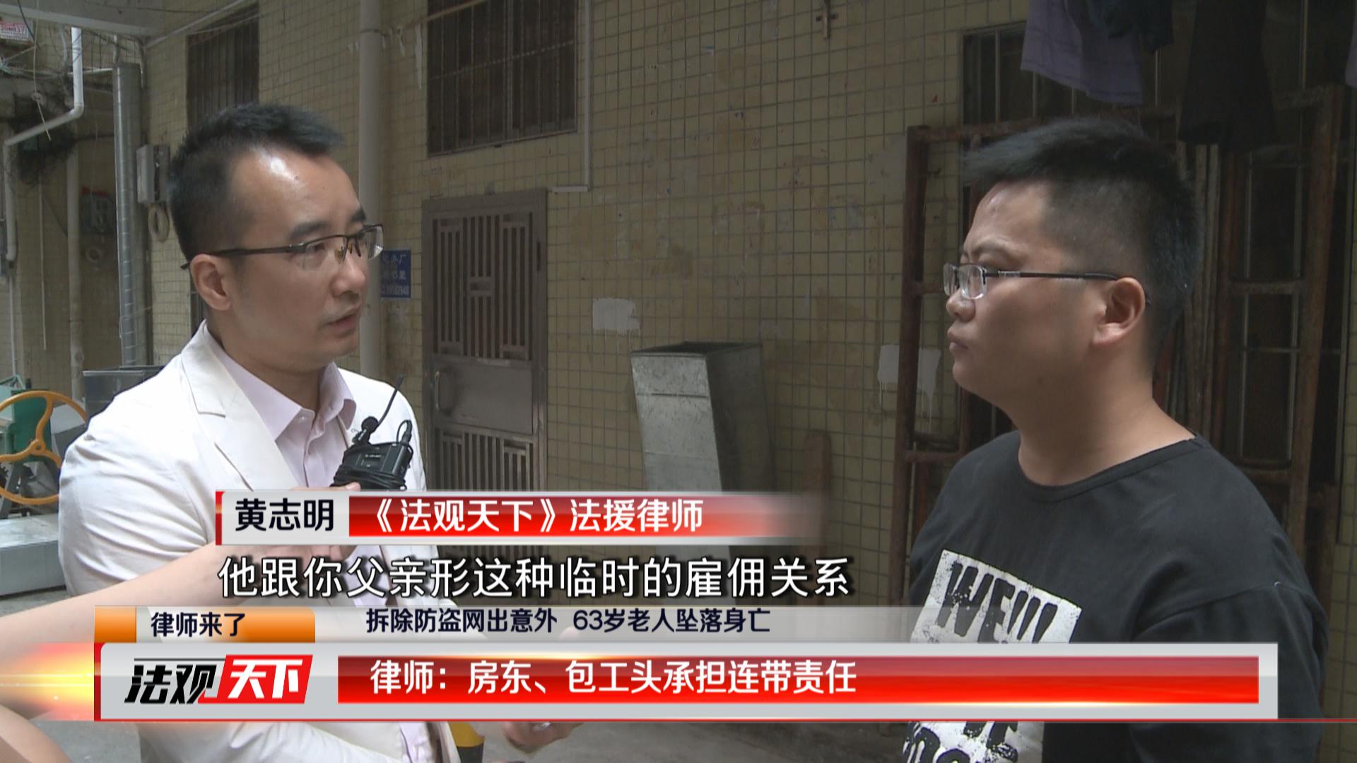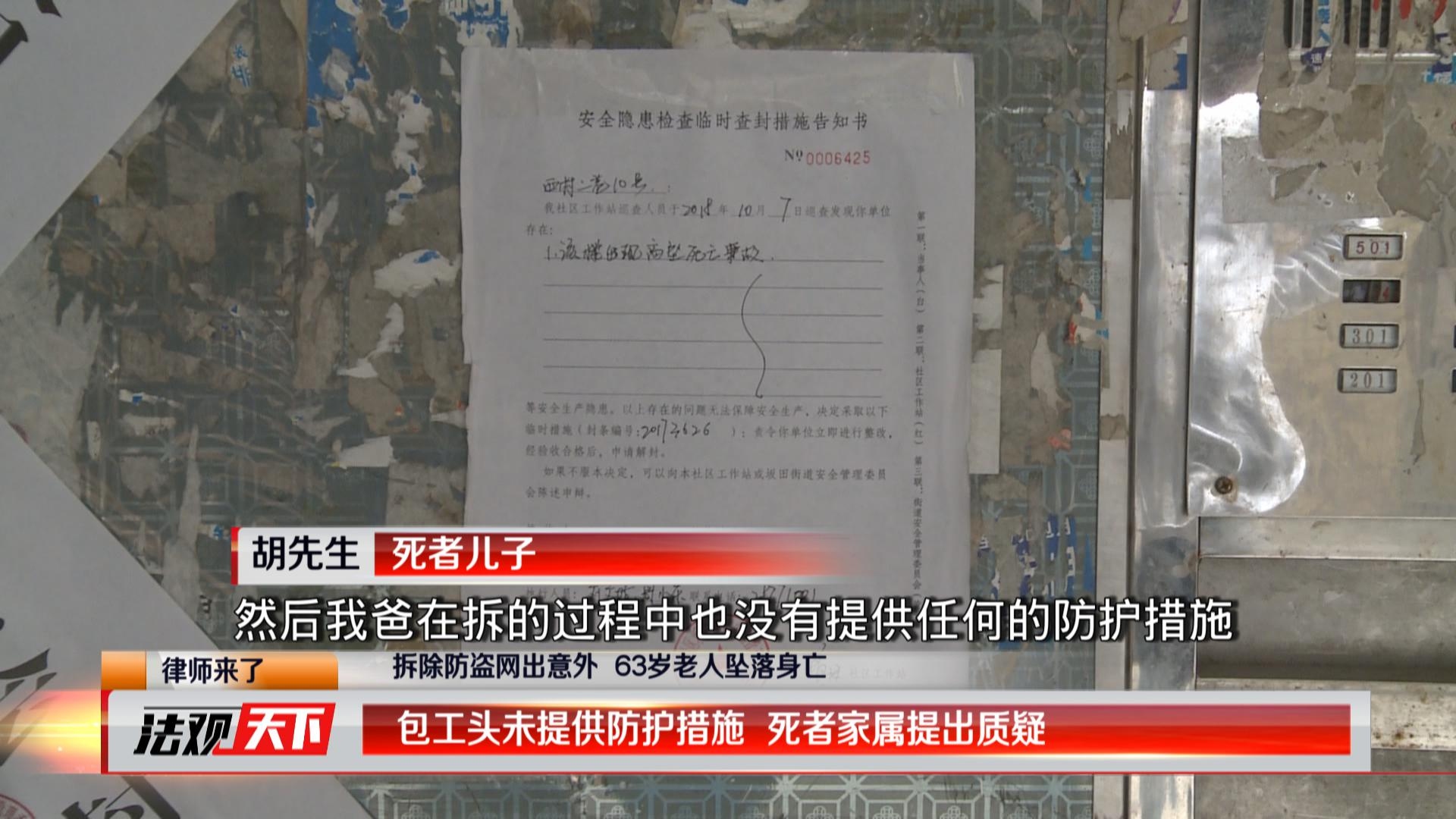 可是在這次事件中,63歲的死者老胡明顯是無證且年齡超標(biāo),在高空作業(yè)時(shí),也沒有相應(yīng)的防護(hù)措施。死者家屬說,事發(fā)后,無論是包工頭還是房東都沒有出面承擔(dān)相應(yīng)的責(zé)任。