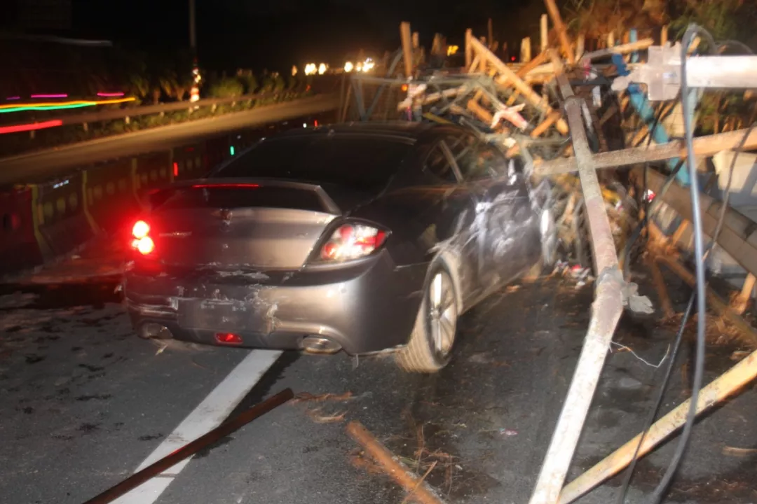 執(zhí)勤民警接報(bào)后立即前往龍崗區(qū)長深高速3655KM往鹽田方向路段(高速路)處理事故,現(xiàn)場發(fā)現(xiàn)肇事粵B牌小車駛進(jìn)了高速公路右邊的施工區(qū)域撞上了鐵管,氣囊爆開,擋風(fēng)玻璃被鐵管直接刺穿,車輛損毀嚴(yán)重。