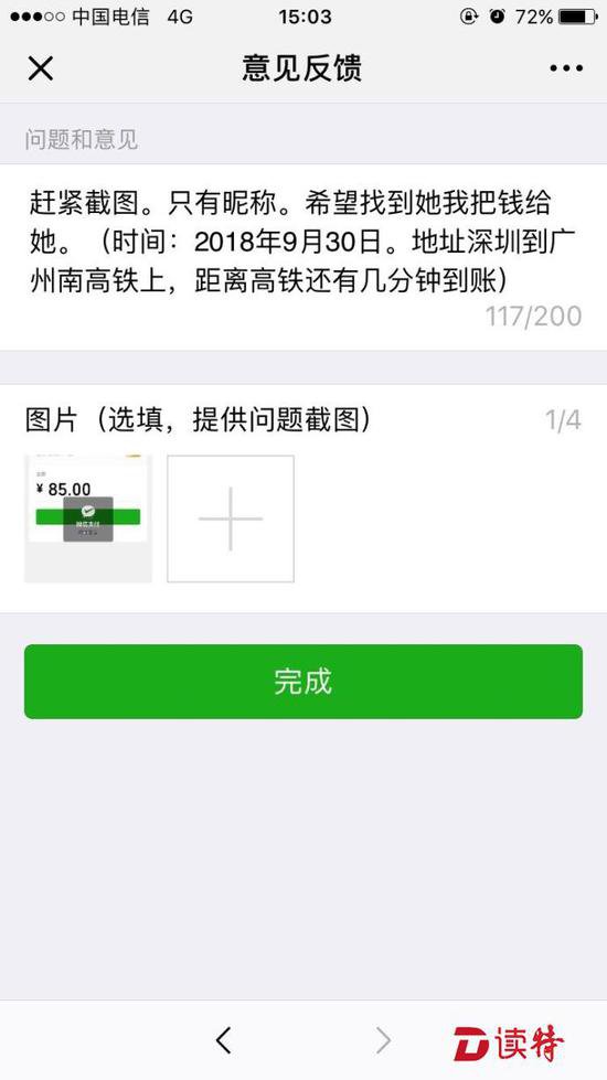 可由于高鐵上網(wǎng)絡(luò)信號(hào)不好,李先生的微信支付一直顯示是"處理中",過了一分鐘才顯示轉(zhuǎn)帳失敗,而這時(shí),高鐵已經(jīng)到了廣州南站,李先生又下了車,在廣州南站下車的乘客中找了幾分鐘,但沒有找到這個(gè)女孩。由于自己也要在廣州南站轉(zhuǎn)車,李先生時(shí)間也很緊,就匆忙上了下一趟去武漢的火車。