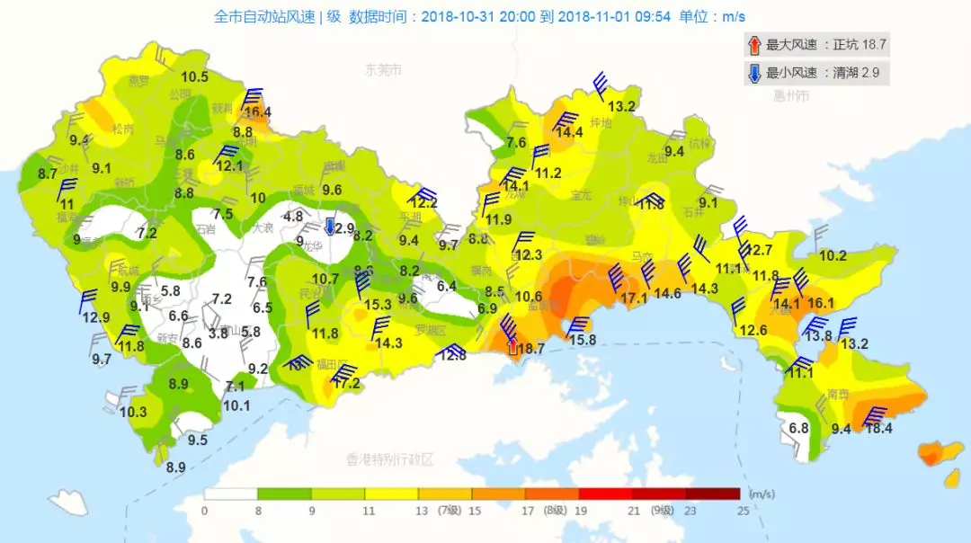受“玉兔”疊加冷空氣影響,11月1日凌晨我市沿海和高地風(fēng)力已經(jīng)出現(xiàn)5-6級(jí)陣風(fēng),最大陣風(fēng)8級(jí)出現(xiàn)在鹽田區(qū)沙頭角街道正坑站。