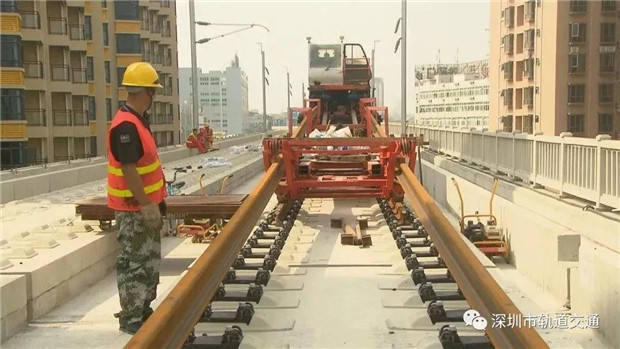 鋪軌機(jī)把長(zhǎng)軌放入無(wú)碴道床就位