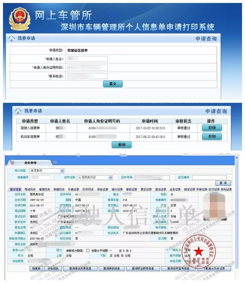 ②登入網(wǎng)上深圳交警 →網(wǎng)上車管所 →駕駛證業(yè)務(wù) →在線申請 →駕駛證信息單查詢及打印、駕駛?cè)税踩鹿市庞帽聿樵兗按蛴?/p>