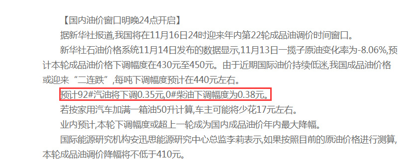 16日晚24時,成品油迎來11月第二次調價