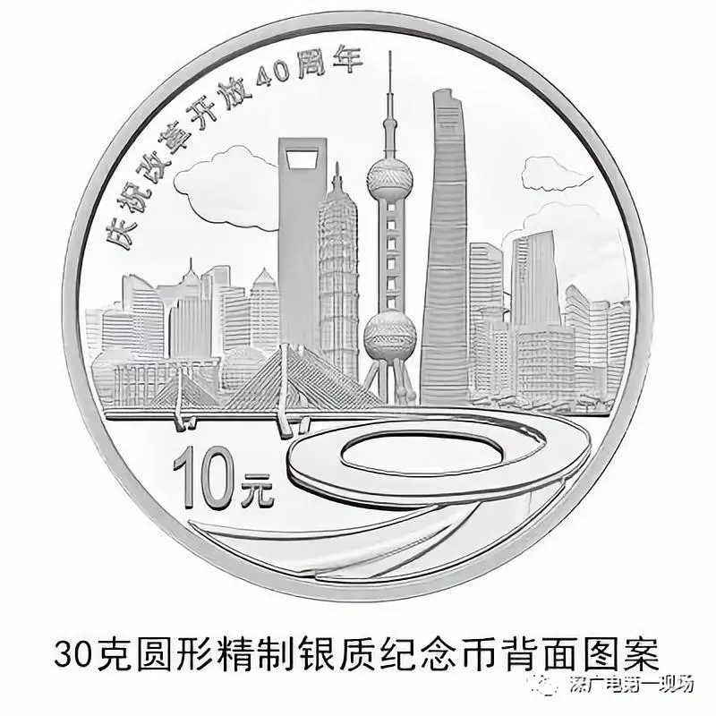 30克圓形銀質(zhì)紀(jì)念幣背面圖案之三為上海浦東標(biāo)志性建筑及南浦大橋、黃浦江等組合設(shè)計(jì),并刊“慶祝改革開放40周年”字樣及面額。