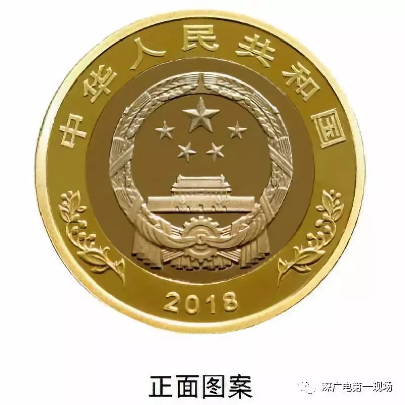 雙色銅合金紀(jì)念幣正面圖案為國(guó)徽,國(guó)徽上方刊“中華人民共和國(guó)”國(guó)名,下方刊年號(hào)“2018”字樣,左右兩側(cè)為果實(shí)圖案。