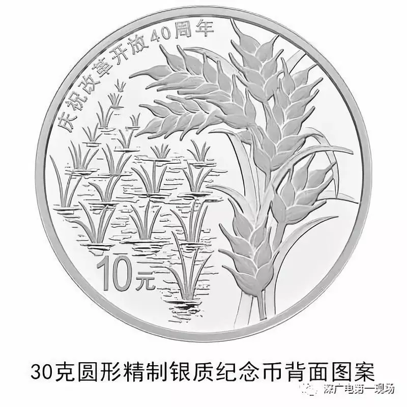 30克圓形銀質(zhì)紀(jì)念幣背面圖案之一為象征農(nóng)村改革啟始(安徽小崗村)的禾苗和稻穗,并刊“慶祝改革開放40周年”字樣及面額。