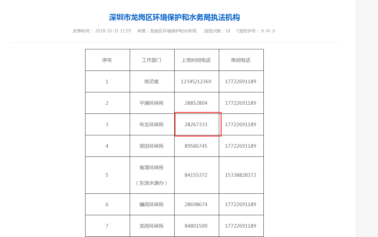 深圳市龍崗區(qū)環(huán)境保護(hù)和水務(wù)局官網(wǎng)掛出的布吉環(huán)保所電話