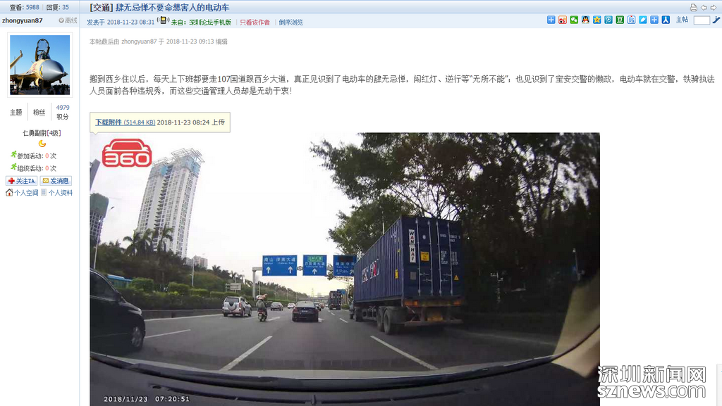 深圳新聞網(wǎng)11月28日訊(記者 劉婷)“電動(dòng)車闖紅燈、逆行、搶道等‘無所不能'。”近日,深圳論壇網(wǎng)友“zhongyuan87”發(fā)帖吐槽電動(dòng)車在107國道、西鄉(xiāng)大道無視交通規(guī)則肆意駕駛,擾亂正常秩序。(網(wǎng)帖:https://szbbs.sznews.com/thread-3824524-1-1.html)