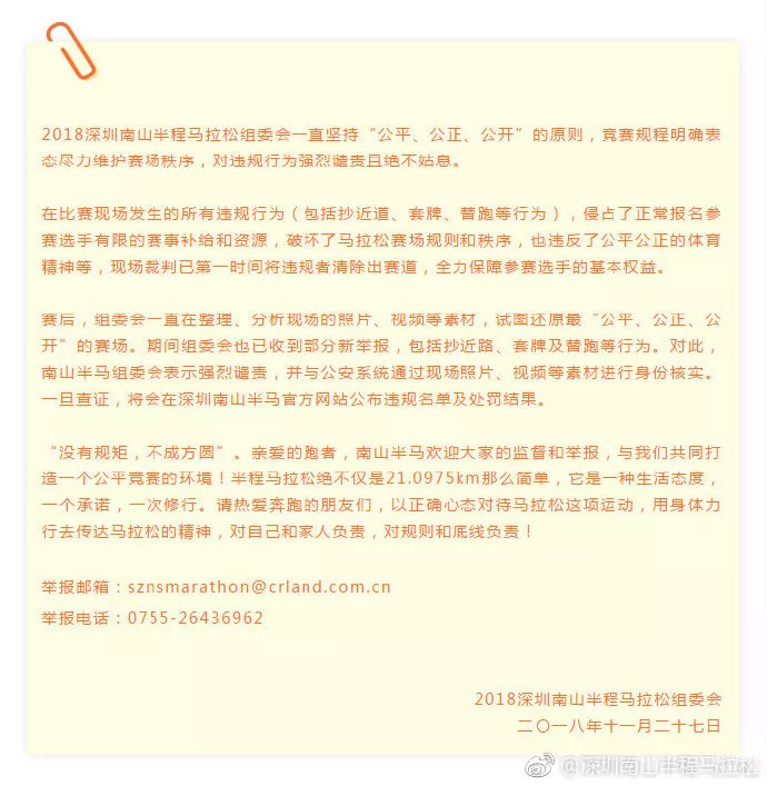 https://mp.weixin.qq.com/s/xge5TY29hk9IjLRMCAG43w希望廣大跑者遵守賽事規(guī)程,尊重其他正常參賽的跑者,尊重體育精神,自覺維護(hù)賽場(chǎng)秩序;深圳南山半程馬拉松組委會(huì)將在今后賽事中加強(qiáng)賽事監(jiān)督管理并融入技術(shù)手段,以跑者體驗(yàn)至上,共同營造健康、公正、公平的馬拉松參賽環(huán)境。