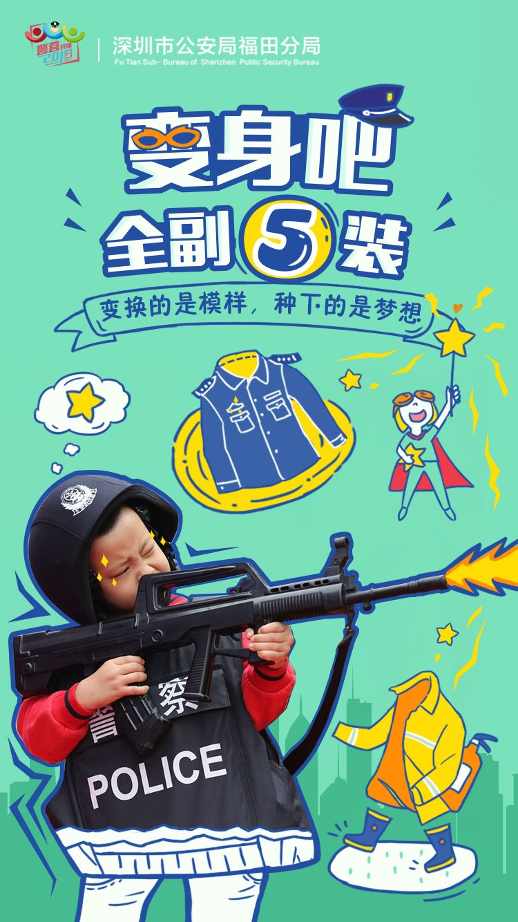 福田警方從11月26日開(kāi)始,連續(xù)推出開(kāi)放日倒計(jì)時(shí)5期主題海報(bào):“變身吧,全副‘5’裝”、“趣玩吧,‘四’意嬉戲”、“學(xué)習(xí)吧,舉一反‘3’”、“見(jiàn)面吧,為你‘2’來(lái)”、“一起吧,‘1’起警彩”,向市民發(fā)出邀請(qǐng)函,通過(guò)官方微信、微博等新媒體平臺(tái)發(fā)布,搶先看精彩。