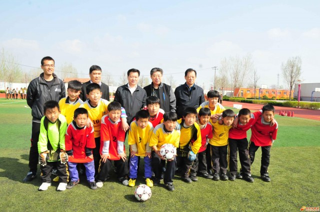 亞足聯(lián)副主席張吉龍(后排右二)、省體育局局長張松林(后排右一)、市委書記、市人大常委會(huì)主任張光峰(后排右三)與定呂小學(xué)足球隊(duì)合影
