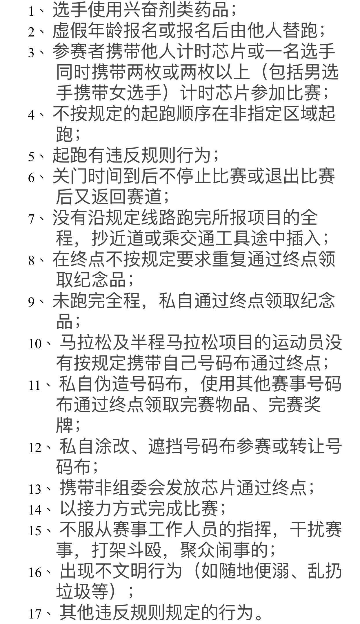 據(jù)悉,在比賽期間選手出現(xiàn)17項違規(guī)行為之一的問題,裁判員有權(quán)中止選手的比賽并當場沒收違規(guī)選手的號碼布及芯片,取消其比賽資格,賽后由組委會視情節(jié)輕重分別給予參賽選手取消2018深馬比賽成績、禁賽1至2年,情節(jié)嚴重者終身禁賽等處罰,并將違規(guī)信息報送中國田協(xié)申請系列追加處罰。