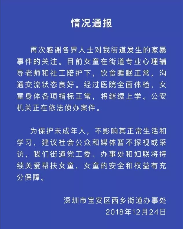 12月24日晚上,深圳市寶安區(qū)委宣傳部官方微博@陽光寶安再次發(fā)布通告,稱女童目前飲食睡眠正常,將繼續(xù)上學(xué)。公安機(jī)關(guān)正在依法偵辦案件。