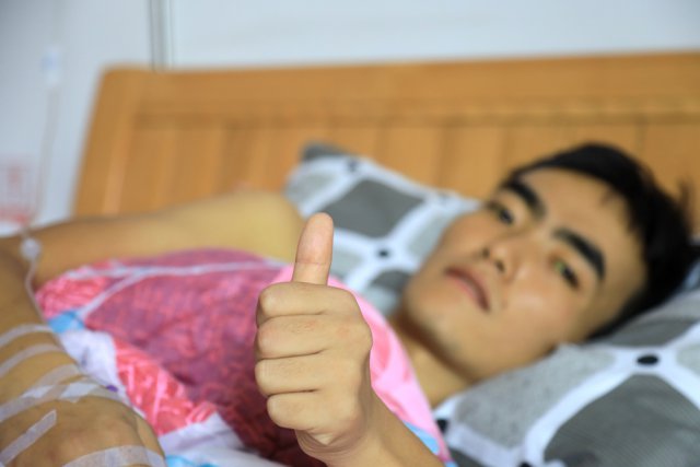 11月24日中午,他坐在輪椅上,讓他的父親向恒金推著他在陽光下散步。"這里的空氣好新鮮。我喜歡這里。"他笑呵呵地對記者說。