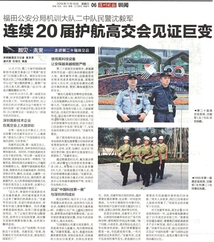★★11月18日,為期五天的第二十屆中國國際高新技術(shù)成果交易會在深圳會展中心圓滿落幕。福田公安分局在高交會警力部署、科技管控、防控打擊、安全宣傳、管理服務(wù)等方面一絲不茍,每日投入千名警力現(xiàn)場值守,實現(xiàn)了本屆高交會“零警情、零發(fā)案”,確保了各項展會活動安全、有序、順利舉行。