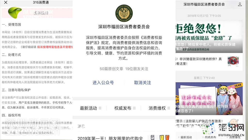 福田區(qū)消委會(huì)微信公眾號(hào)界面,包含消費(fèi)維權(quán)投訴、發(fā)布消費(fèi)警示等內(nèi)容。