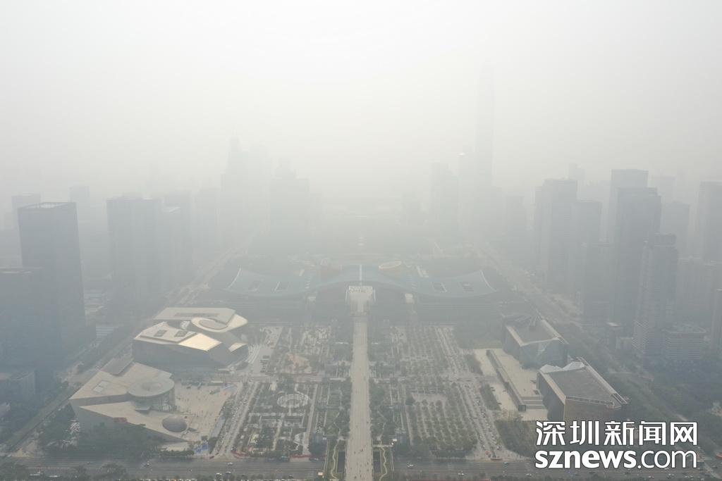 1月12日,霧霾襲深,深圳天氣君發(fā)布預(yù)警,今天最好不要在室外玩耍。記者中午用無人機航拍福田CBD區(qū)域,鏡頭下,市民中心和平安金融大廈兩個地標(biāo)幾乎無法辨別,新洲路上能見度很低,一切都仿佛浸在化不開的濃湯里。深圳天氣君在微博提醒:弱北風(fēng)影響下,不利于污染物擴散,我市中西部地區(qū)下午會持續(xù)十面“霾”伏,灰霾黃色預(yù)警信號生效中,各位盡量不要長時間戶外活動。