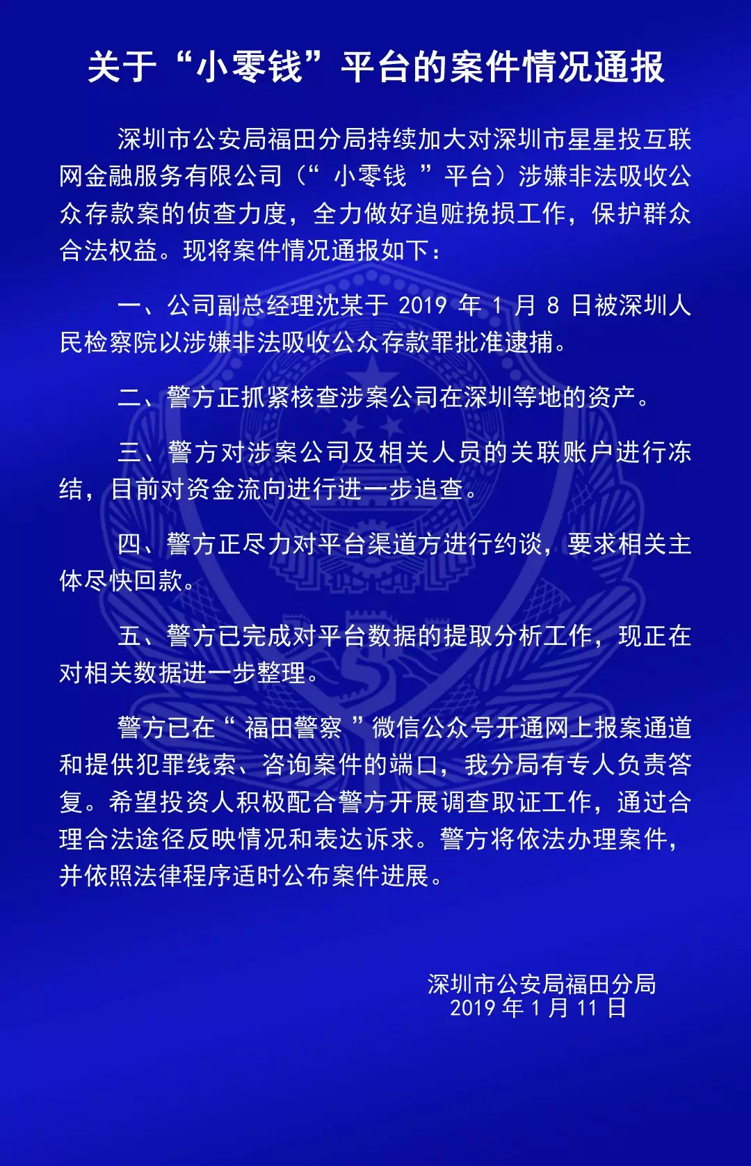 福田公安通報六家平臺涉嫌非法吸收公眾存款案的情況